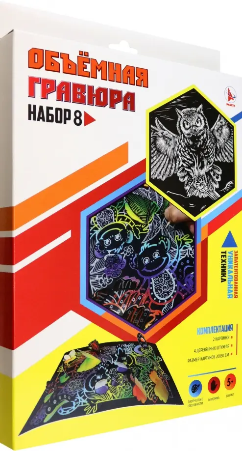 Творческий набор серии Объемная гравюра специально создан для самых маленьких деток, которые только начинают знакомиться с увлекательным миром творчества. Работая с гравюрой, малыш превратится в настоящего волшебника, который штрих за штрихом создает веселую и разноцветную картину. Увлекательный процесс надолго займет внимание малыша и подарит массу положительных эмоций. В наборе 2 гравюры. Одна объемная, нужно процарапать ее и отогнуть элементы, картинка становится 3д объемной. Вторая обычная гравюра.