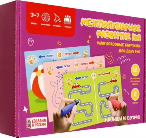 Нужно одновременно двумя руками рисовать на карточках линии. Рисунки для левой руки и для правой руки разные, так происходит межполушарное развитие. Карточки ламинированы и рассчитаны на многократное использование. Рекомендовано педагогами. В наборе 12 двухсторонних карточек (24 картинки) и 2 маркера. Возраст: 3-7 лет. Количество игроков: 1-4. Не предназначено для детей младше 3 лет.