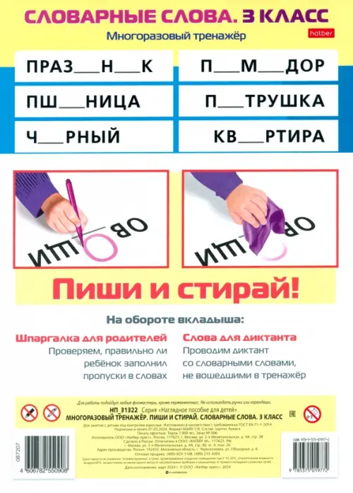 Запоминание словарных слов не всем дается легко. С помощью специального многоразового тренажера учащиеся начальной школы смогут освоить и закрепить грамотное написание словарных слов. Пользоваться пособием просто и удобно. Ребенок вписывает в слова недастающие буквы, а потом проверяет себя или отдает написанное на проверку родителям. Специальное покрытие тренажера позволяет писать и стирать буквы много раз, не боясь сделать ошибку. Внимание! Не предназначено детям до 3-х лет.