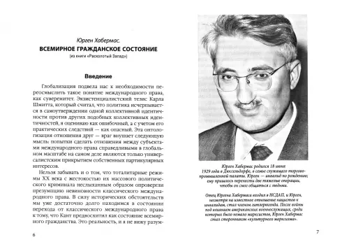Мораль разрубает узел, который политика не могла развязать, пока они были в ссоре, - писал Кант в своем проекте "К вечному миру". Он утверждал, что устройство каждого государства должно быть республиканским, а отношения государств между собой (в рамках всемирно-гражданской федерации) - пацифистскими. Все правовые обязанности, обеспечивающие гражданскую свободу внутри страны и всемирно-гражданский мир за её пределами, соединяются в идее справедливого порядка. Возможно ли осуществление проекта Канта в современную эпоху? Об этом рассуждают Юрген Хабермас, немецкий философ и социолог, один из наиболее влиятельных мыслителей второй половины XX века, и Чарльз Тейлор, канадский философ, чьи идеи мультикультурализма легли в основу "Хартии земли". Вслед за Кантом большее значение они отводят публичной сфере и общественному мнению, которые должны обеспечить переход от вертикальной общественной иерархии опосредованного доступа к горизонтальному обществу прямого доступа. В то же время Хабермас и Тейлор пишут об опасностях манипулирования общественным мнением, построения "социального воображаемого", а также о других подобных особенностях эпохи постмодерна.