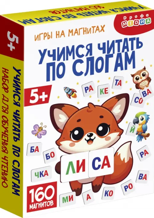 В комплекте: 160 магнитных фишек со слогами и отдельными буквами, правила.