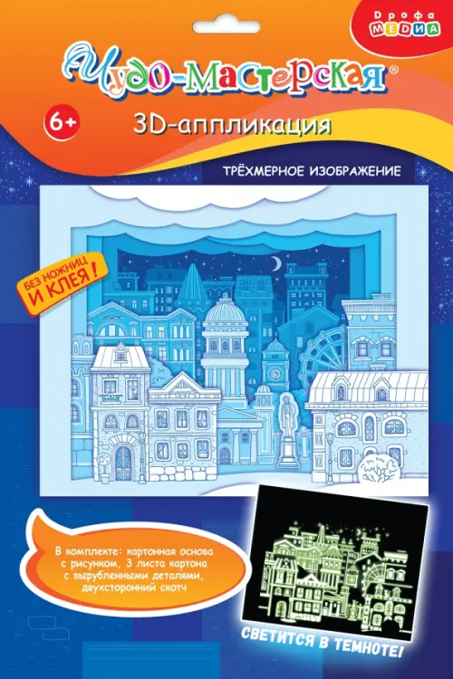 3D-аппликация - современный и очень увлекательный вид творчества. Уникальность нашей аппликации в том, что она светится в темноте. В творческом наборе вы найдёте готовые детали для аппликации из плотного картона, которые нужно приклеить на картинку с помощью объёмного двустороннего скотча.