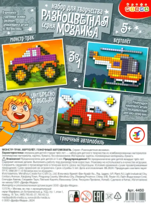 Набор для творчества от Дрофы Медиа "Монстр-трак. Вертолёт. Гоночный автомобиль" обязательно понравится мальчикам! Это набор разноцветных мозаик, в котором три картинки: могучий монстр-трак, транспортный вертолёт и быстрый гоночный автомобиль.