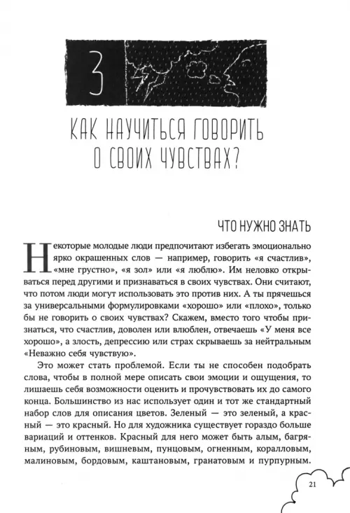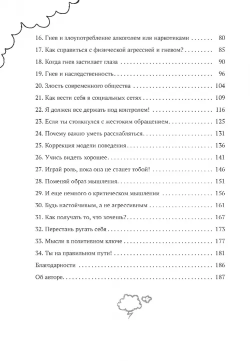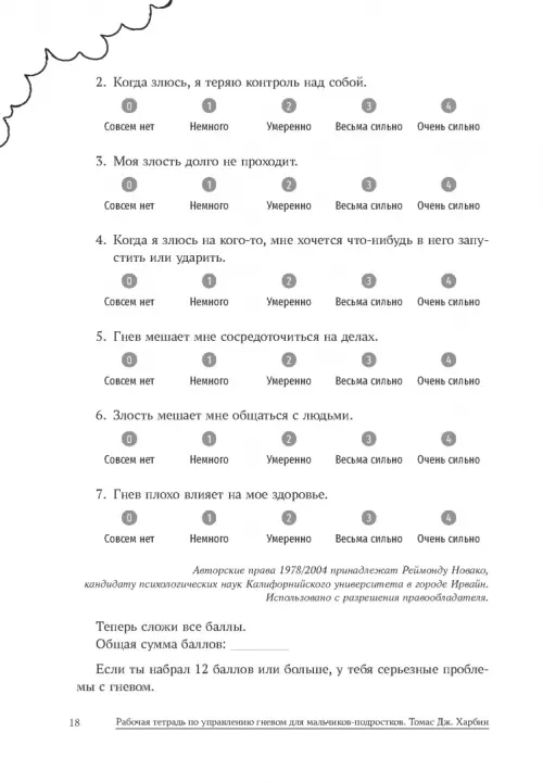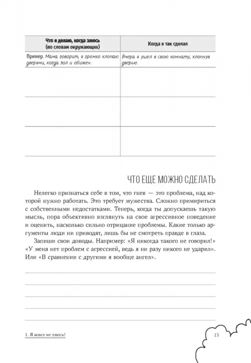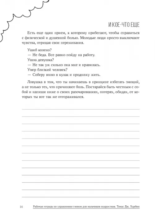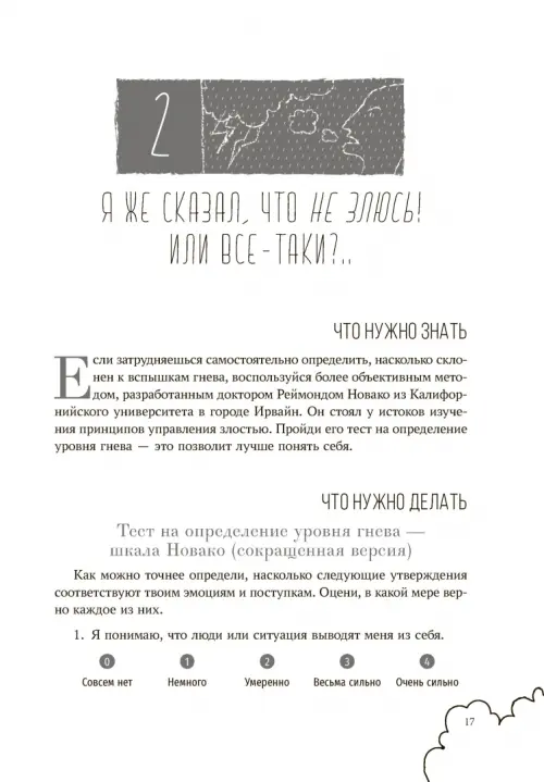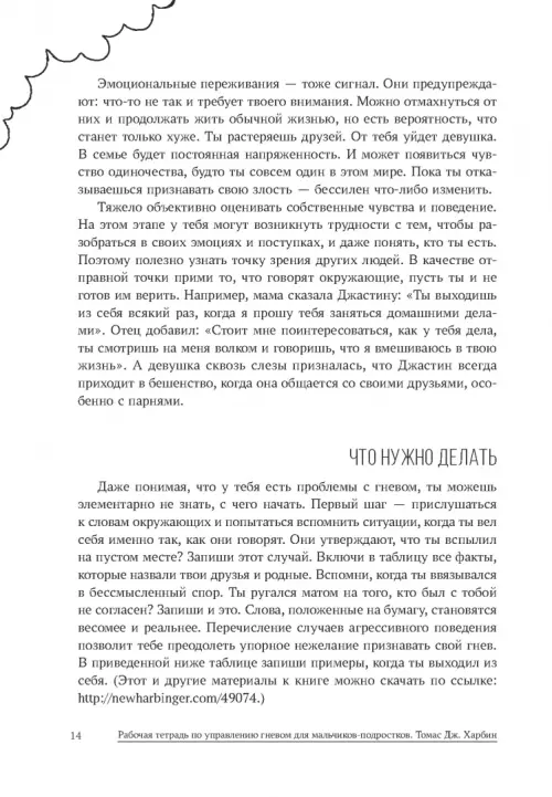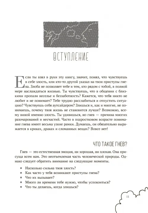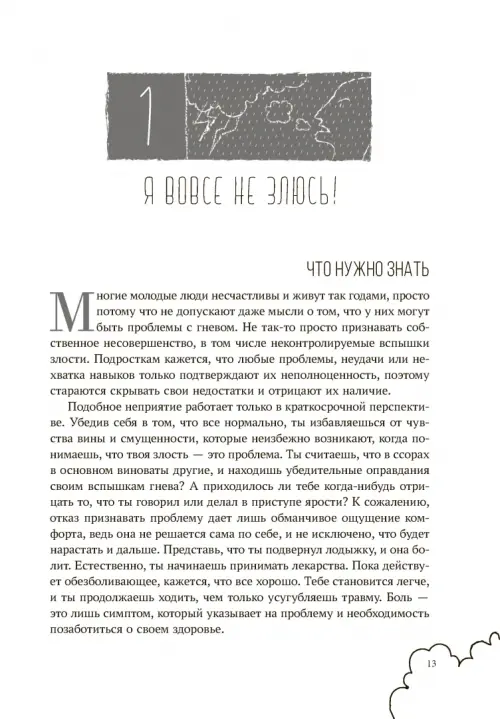 Быть подростком довольно трудно: много обязанностей, учеба, необходимость определиться с будущим, желание выделиться среди сверстников, стремление, чтобы взрослые считались с твоим мнением на равных. И не всегда есть силы на то, чтобы справляться со всем этим. Зачастую эмоциональные переживания выливаются в гнев и раздражение, после которых ты испытываешь муки совести. Наше общество поощряет подавление чувств (как чрезмерной радости, так и грусти) — ты всегда должен быть спокоен и собран, т.е. удобен для окружающих. Возможно, в ответ на твои переживания тебе говорили что-то вроде «прекрати привлекать к себе внимание», «не делай из мухи слона» или «просто будь мужчиной». Однако ты не можешь вечно скрывать свои переживания. Это приведет к тому, что ты станешь еще более взрывным, конфликтным, нетерпимым к другим, нелюдимым или отчужденным. Эта рабочая тетрадь нужна для того, чтобы ты научился выражать свои эмоции, не подавлял их, но и не выглядел при этом неадекватно, не отталкивал от себя людей вспышками гнева или раздражения.