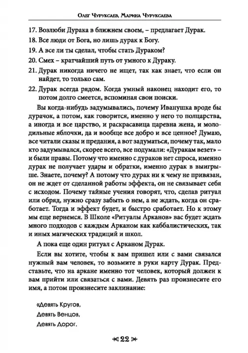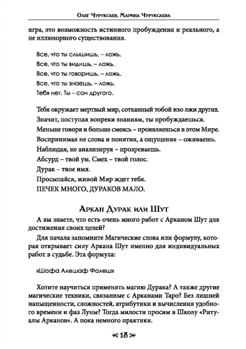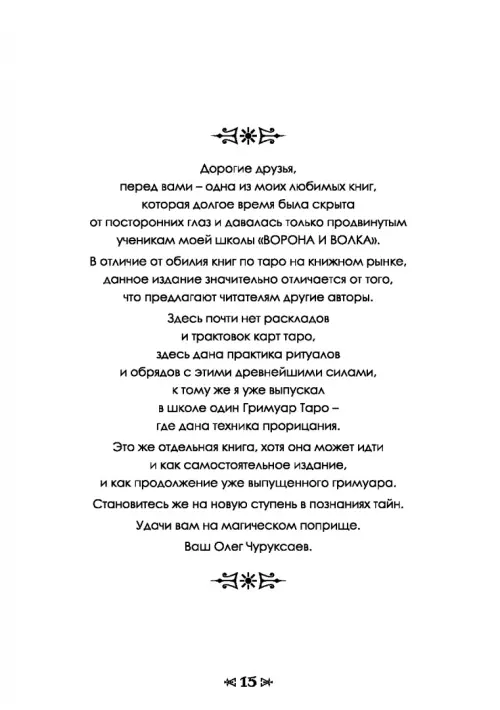 Дорогие мои друзья и ученики! Рад вам представить 8-й том своей Школы "Ворона и Волка". Он не совсем обычный. Его написала моя жена - Марина Чуруксаева, таролог с мировым уровнем. Более 20 лет она занимается Таро, и, скажу я вам, довольно неплохо. Я когда смотрел рукопись, сам был восхищён материалом, который она даёт в данной книге. Мы как-то раз поспорили, кто сильнее в искусстве предсказаний. Как колдуна она, конечно, меня уважает, но по предсказаниям и работе по Таро считала себя лучшей. Я не стал комплектовать, а просто ей заказал книгу в единственном экземпляре - Гримуар Таро. Я её отправил в Велигор, но не знаю, напечатают или нет. Ну а пока - книга моей жены Марины, которую она написала в ответ мне. Могу сказать одно: книга достойна вашего внимания. Ну и конечно, в качестве приложения я даю свой материал, в данном по Чёрной Магии - Вторую Ступень. Первая уже в издательстве.