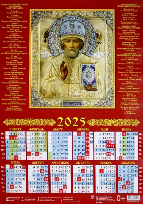 Календарь на 2025 год настенный листовой Святитель Николай Чудотворец