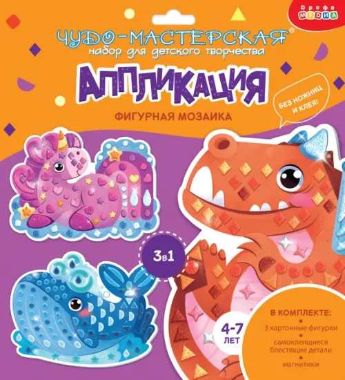 Никаких клея и ножниц – в наборе есть всё для работы. Блестящие детали мозаики легко отклеиваются от основы и надёжно крепятся к фигурке. В комплект входят магнитики, с помощью которых готовую работу можно повесить на магнитную доску или холодильник.
