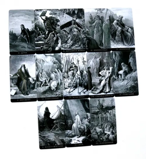 Таро, иллюстрированное работами известного французского художника-гравёра Гюстава Доре в чёрно-белом исполнении, подобно пространству души, соединяющему Земное и Небесное. На каждой из карт запечатлена одна из оригинальных литографий Доре, символика которой способна резонировать с различными сферами и событиями нашей жизни. В колоде представлены 78 оригинальных гравюр Гюстава Доре, наполненных драматической и мистической энергией и идеально соответствующих Архетипам современного Таро.