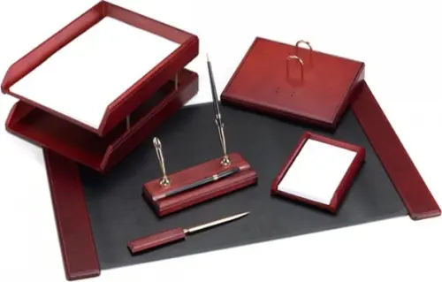В наборе 6 предметов: подкладка для стола, подставка для ручек (с 2 ручками), подставка для бумаги, подставка для календаря, лоток для бумаг (2 отделения), нож для бумаги.