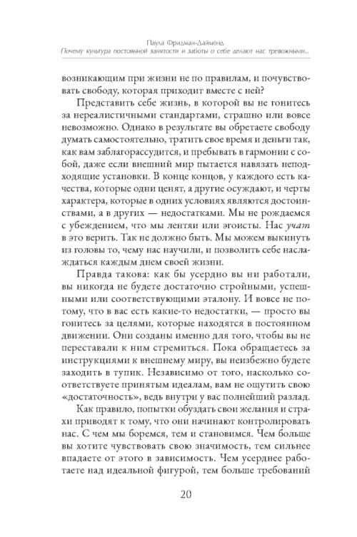 «Представить себе жизнь, в которой вы не гонитесь за нереалистичными стандартами, страшно или вовсе невозможно. Однако в результате вы обретаете свободу думать самостоятельно, тратить свое время и деньги так, как вам заблагорассудится, и пребывать в гармонии с собой, даже если внешний мир пытается доказать, что это не так».