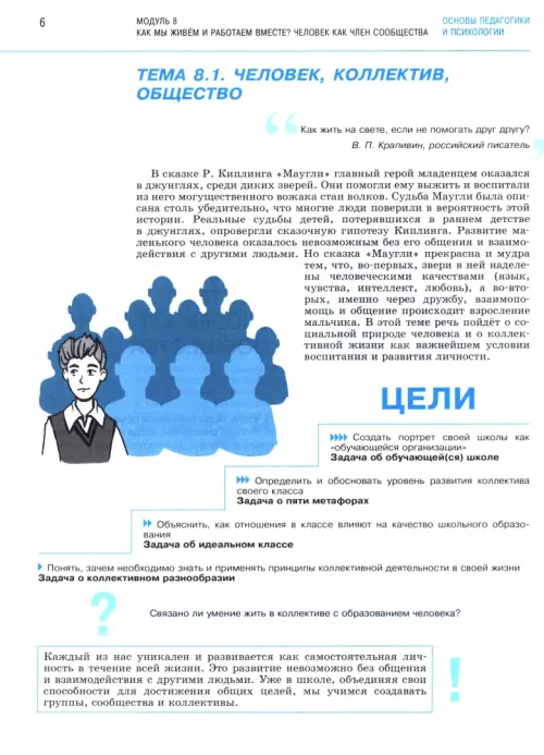 Учебник, предназначенный для учащихся педагогических классов на уровне среднего общего образования, призван помочь учащимся с выбором будущей профессии путём активного включения в познавательную и волонтёрскую деятельность в рамках выбранного направления. Авторы - известные российские учёные: педагоги и психологи, преподаватели ведущих вузов России - уделяют первостепенное внимание практическому применению полученных знаний. Методический аппарат учебника ориентирован на достижение метапредметных результатов, развитие функциональной грамотности школьников и нацелен на активные формы усвоения материала, в том числе с использованием современных технологий: цифрового дополнения с авторскими видеолекциями и тестами для самопроверки.