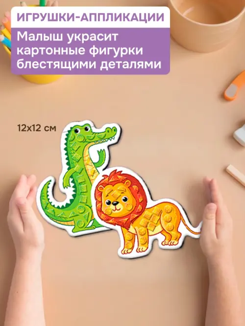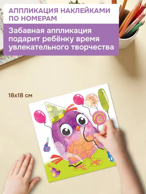 В наборе: основы для аппликаций из картона и мягкого пластика (12 шт.), листы с деталями из картона и мягкого пластика (4 шт.), фольга (8 шт.), листы с наклейками (2 шт.), листы для поделок оригами (2 шт.), декоративная нить, деревянная палочка, объёмный двухсторонний скотч, магнитик.