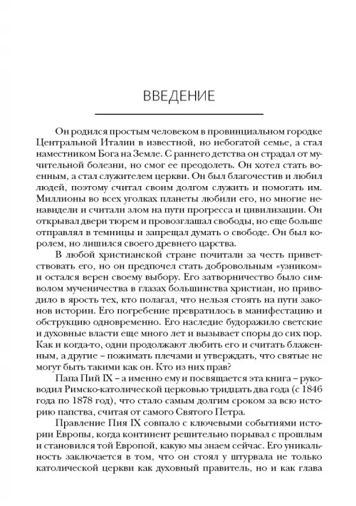 Первая книга на русском языке, посвященная исследованию биографии и исторической роли папы Пия IX - последнего папы-короля. Пий IX руководил Римско-католической церковью с 1846-го по 1878-й - тридцать два года, что стало самым долгим сроком за всю историю папства, считая от самого Святого Петра.