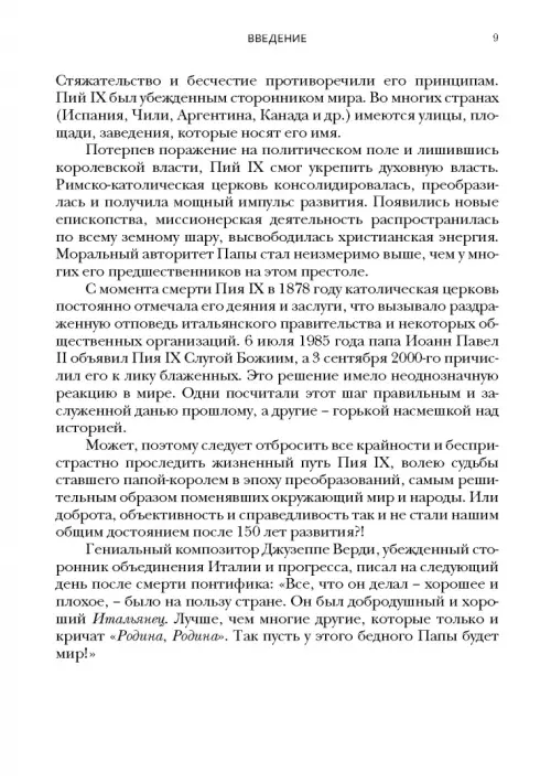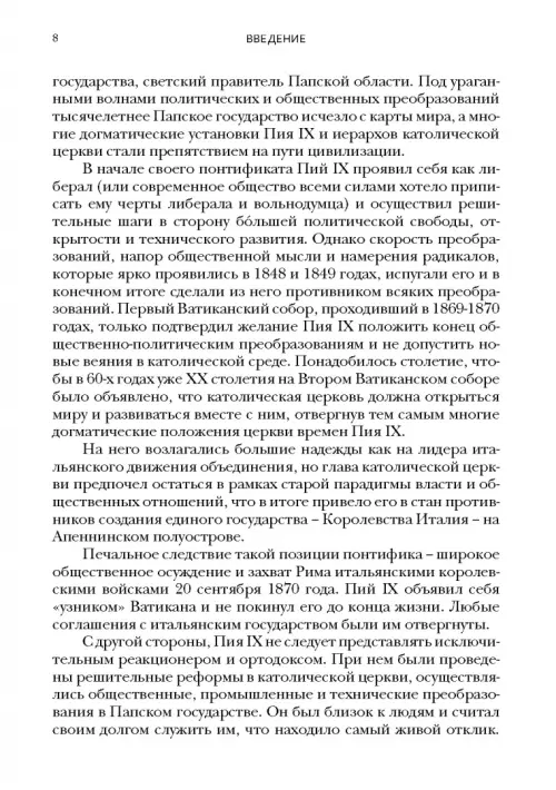 Правление Пия IX совпало с ключевыми событиями истории Европы, когда континент решительно порывал с прошлым и становился той Европой, которую мы знаем сейчас. Его уникальность заключается в том, что он стоял у штурвала не только католической церкви как ее духовный правитель, но был также и главой государства, королем Папской области. Под ураганными волнами политических и общественных преобразований тысячелетнее Папское государство исчезло с карты мира, а многие догматические установки Пия IX и иерархов католической церкви стали препятствием на пути цивилизации.