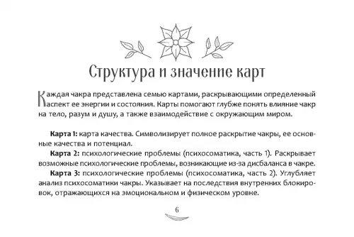 Каждая карта связана с одной из чакр - энергетических центров, через которые мы проживаем эмоции, желания, страхи. Колода бережно приглашает вас исследовать эти потоки и узнать, как они влияют на ваш жизненный выбор, поведение и общее самочувствие. При работе с образами и символами вы начнете лучше ощущать, что происходит внутри, где напряжение, а где - ресурс. Древние знания о чакрах здесь соединены с современными достижениями в психологии, помогая вам по-новому взглянуть на себя и свою жизнь.