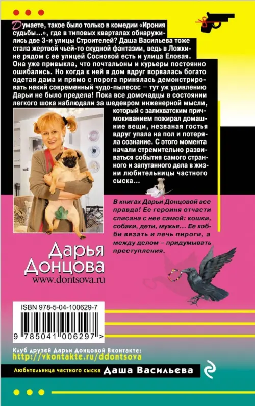 Думаете, такое было только в комедии "Ирония судьбы…", где в типовых кварталах обнаружились две 3-и улицы Строителей? Даша Васильева тоже стала жертвой чьей-то скудной фантазии, ведь в Ложкине рядом с ее улицей Сосновой есть и улица Еловая. Она уже привыкла, что почтальоны и курьеры постоянно ошибались. Но когда к ней в дом вдруг ворвалась богато одетая дама, и прямо с порога принялась демонстрировать некий современный чудо-пылесос - тут уж удивлению Дарьи не было предела! Пока все домочадцы в состоянии легкого шока наблюдали за шедевром инженерной мысли, который с залихватским причмокиванием пожирал домашние вещи, незваная гостья вдруг упала на пол и потеряла сознание. С этого момента начали стремительно развиваться события самого странного и запутанного дела в жизни любительницы частного сыска …