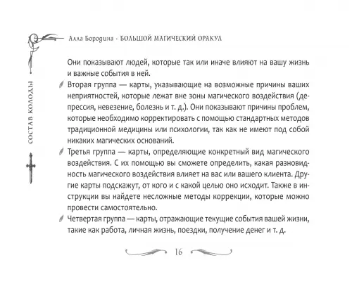 К набору прилагается брошюра: в ней собраны значения всех карт, описаны семь раскладов — от простых до многоуровневых, даны практические рекомендации и советы по тому, как скорректировать негативный расклад, зарядить колоду, очистить свою энергетику и помещение.