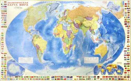 Карта политического мира подробно отражает современное политико-административное устройство мира и границы государств. Территории государств выделены цветом. Населённые пункты отображены по числу жителей и административному значению, показаны основные наземные пути сообщения и судоходные каналы. Особенность данной карты в том, что на ней, помимо геополитической информации, размещена символика государств мира. Государственные флаги стран мира сгруппированы по каждому континенту.