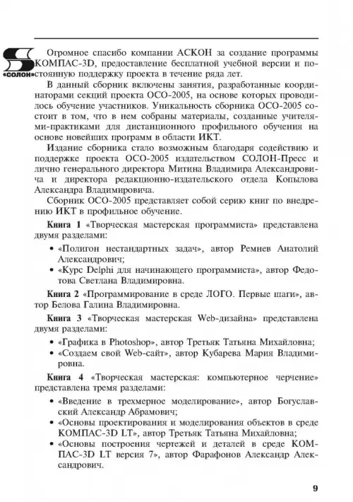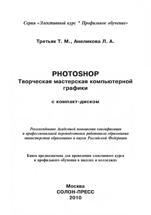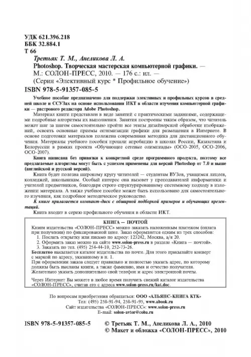 Учебное пособие предназначено для поддержки элективных и профильных курсов в средней школе и ССУЗах на основе использования ИКТ в области изучения компьютерной графики - растрового редактора Adobe Photoshop. Материал книги представлен в виде занятий с практическими заданиями, содержащими подробные алгоритмы их выполнения. Занятия построены таким образом, что читатель может шаг за шагом самостоятельно пройти все этапы дизайнерской обработки изображений, освоить основные приемы оптимизации графики для размещения в Интернете. В основе подготовки материалов положена современная методика для дистанционного обучения. Материалы учебного пособия прошли апробацию в школах России, Казахстана и Белоруссии в рамках проекта "Обучающие сетевые олимпиады" (ОСО-2005, ОСО-2006, ОСО-2007).Книга написана без привязки к конкретной среде программного продукта, поэтому все предлагаемые алгоритмы могут быть с успехом применены для версий Photoshop от 7.0 и выше (английской и русской версий).Книга будет полезна широкому кругу читателей - студентам ВУЗов, учащимся лицеев, колледжей, школьникам. Особый интерес она вызовет у преподавателей информатики и учителей предметников, благодаря строго структурированному системному подходу в изложении материала. А также учебное пособие может быть использовано для самостоятельного изучения, как подробное методическое руководство. К книге прилагается компакт-диск с обширной подборкой примеров и обучающих презентаций. Книга входит в серию профильного обучения в области ИКТ.
