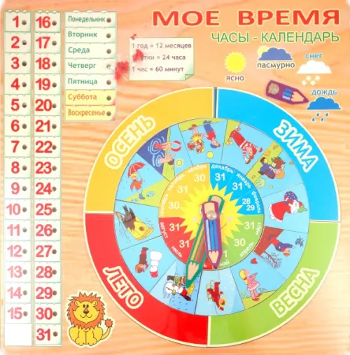 Разборное пособие позволяет изучить чередование месяцев, смену времен года и виды занятий в каждое время года, освоить барометр. При помощи фишек можно отмечать число и день недели.